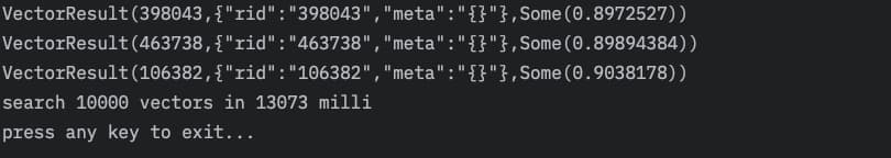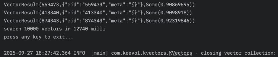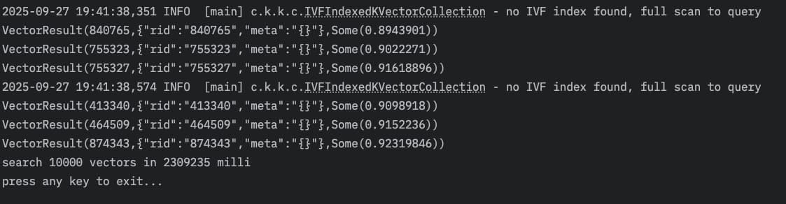 从Sift的这100万向量数据集中查询一万条向量,一共用时159042毫秒(ms), 平均15.9毫秒, 跟KVectors里提供的HNSW+DiskANN版本查询性能相比,差八九毫秒,不过,也还不错,因为我第一版并没有严格按照IVF索引的语义进行的设计和实现,即向量数据我没有全都搬到内存里存放。