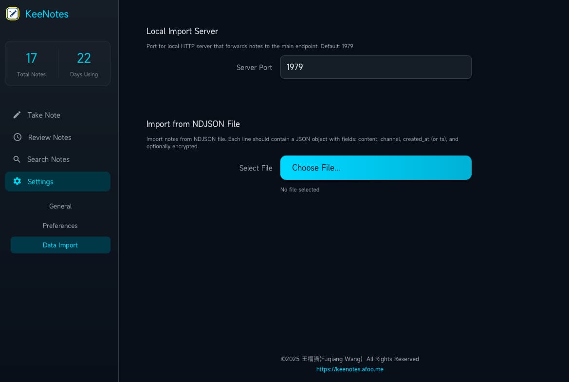 用户如果想把其它系统的数据导入KeeNotes, 只要将原系统的数据导出为NDJSON格式,然后在KeeNotes桌面版的Settings -> Data Import界面选择目标NDJSON文件,KeeNotes桌面版就会自动在后台开始数据导入的任务了。